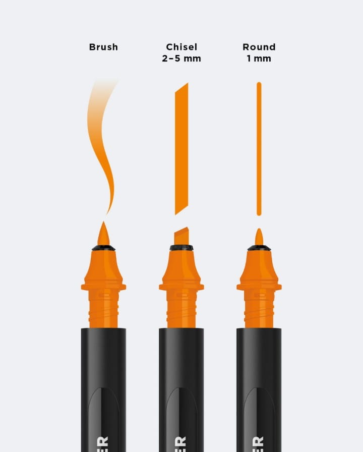 - Marker "uzbrojony" w dwa kartridże z filcami chisel i brush.